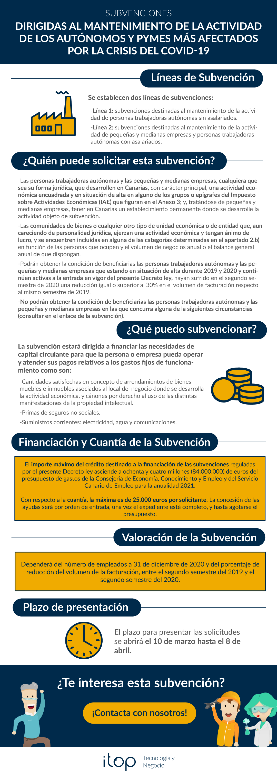 Se ha aprobado el DECRETO ley 2/2021, de 1 de marzo, por el que se regula la concesión directa de "Subvenciones dirigidas al mantenimiento de la actividad de personas trabajadoras autónomas y pequeñas y medianas empresas, de los sectores más afectados por la crisis derivada de la COVID-19", promovidas por el Gobierno de Canarias para ayudar a los autónomos y Pymes que se han visto afectados por la situación de la pandemia.