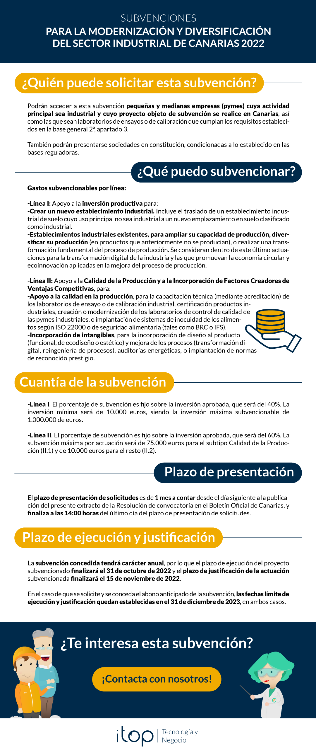 Podrán acceder a esta subvención pequeñas y medianas empresas (pymes) cuya actividad principal sea industrial y cuyo proyecto objeto de subvención se realice en Canarias, así como las que sean laboratorios de ensayos o de calibración que cumplan los requisitos establecidos en la base general 2ª, apartado 3.