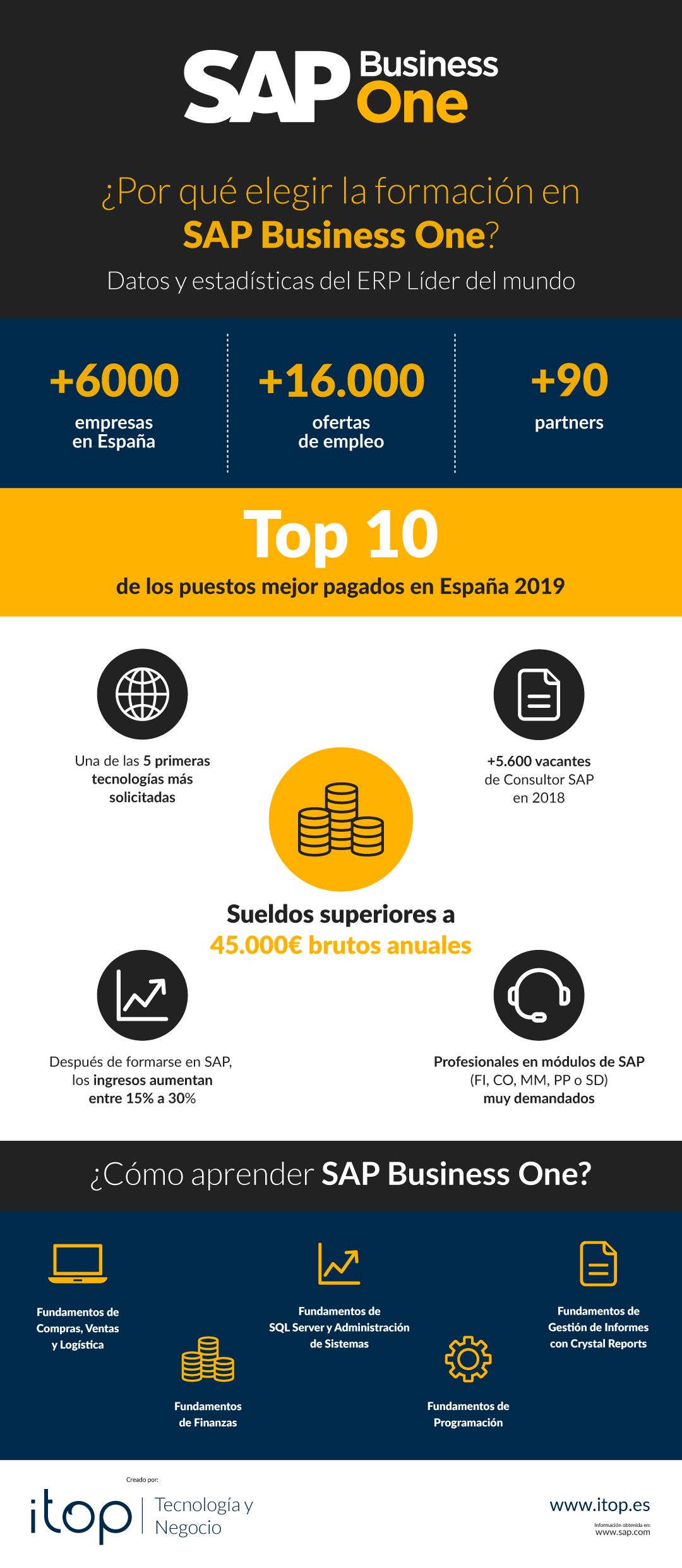 Ante esta necesidad de formación, en Itop Academy ofrecemos 5 cursos online especializados en SAP Business One, los de Compras, Ventas y Logística y el de Finanzas, ambos para la versión 9.3 y orientados a un perfil más funcional y administrativo, mientras que para los perfiles más técnicos tenemos los de Programación, Introdución a la Administración de Sistemas y SQL Server y el de Gestión de Informes en Crystal Reports.