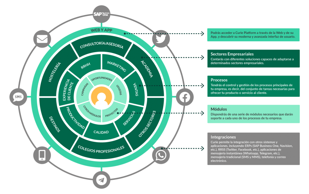 Sin embargo, podemos resolver este inconveniente o problema si disponemos de un software o plataforma que integre absolutamente todo. Un ejemplo muy válido e interesante es el de Curie Platform, una plataforma que no solo incluye un CRM sino que además trabaja con tecnologías como la Inteligencia de Cliente.