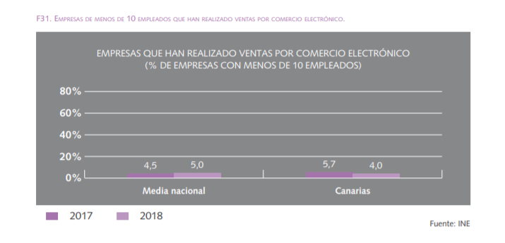 En lo que respecta al comercio electrónico, las empresas canarias con menos de diez empleados que venden a través de internet han pasado del 5,7% al 4% en 2018 cayendo por debajo de la media nacional.