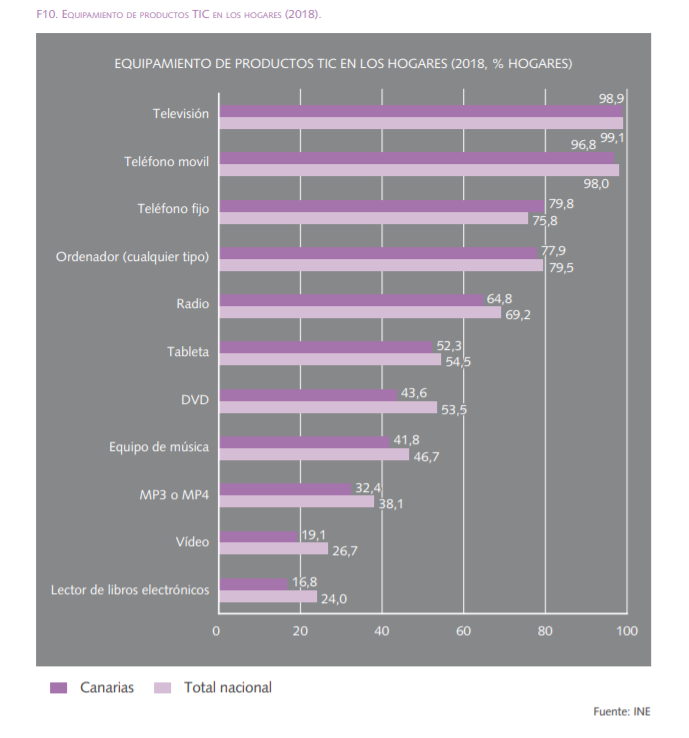 La disponibilidad de equipamiento de TIC en los hogares de Canarias, por ejemplo, es inferior excepto para televisión y tecnología fija. Aunque en el último año, destaca la evolución en la disponibilidad de ordenador, que se acerca al 78% de los hogares.