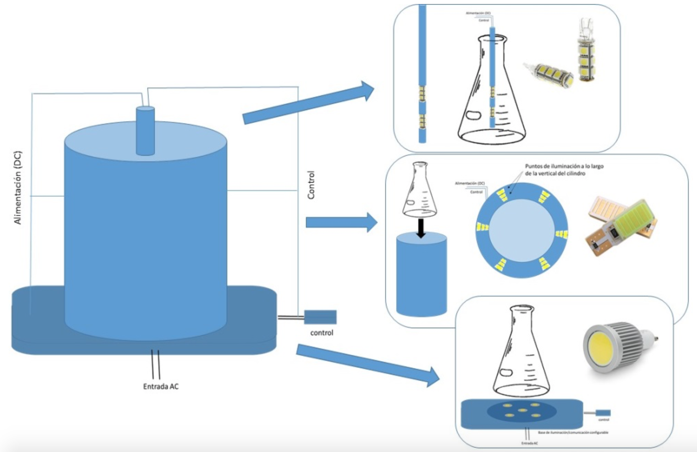 En este proyecto se aborda el desarrollo de prototipos basados en la tecnología de comunicaciones ópticas por radiación visible (VLC), concretamente aquellos utilizados en sistemas de comunicaciones subacuáticos (UWOC), para su aplicación en los sistemas de cultivo de microalgas. En concreto, se pretende abordar un sistema de doble uso (iluminación configurable y comunicación óptica por luz visible) basado en lámparas inteligentes de estado sólido aplicado al cultivo y la producción de microalgas y cianobacterias.