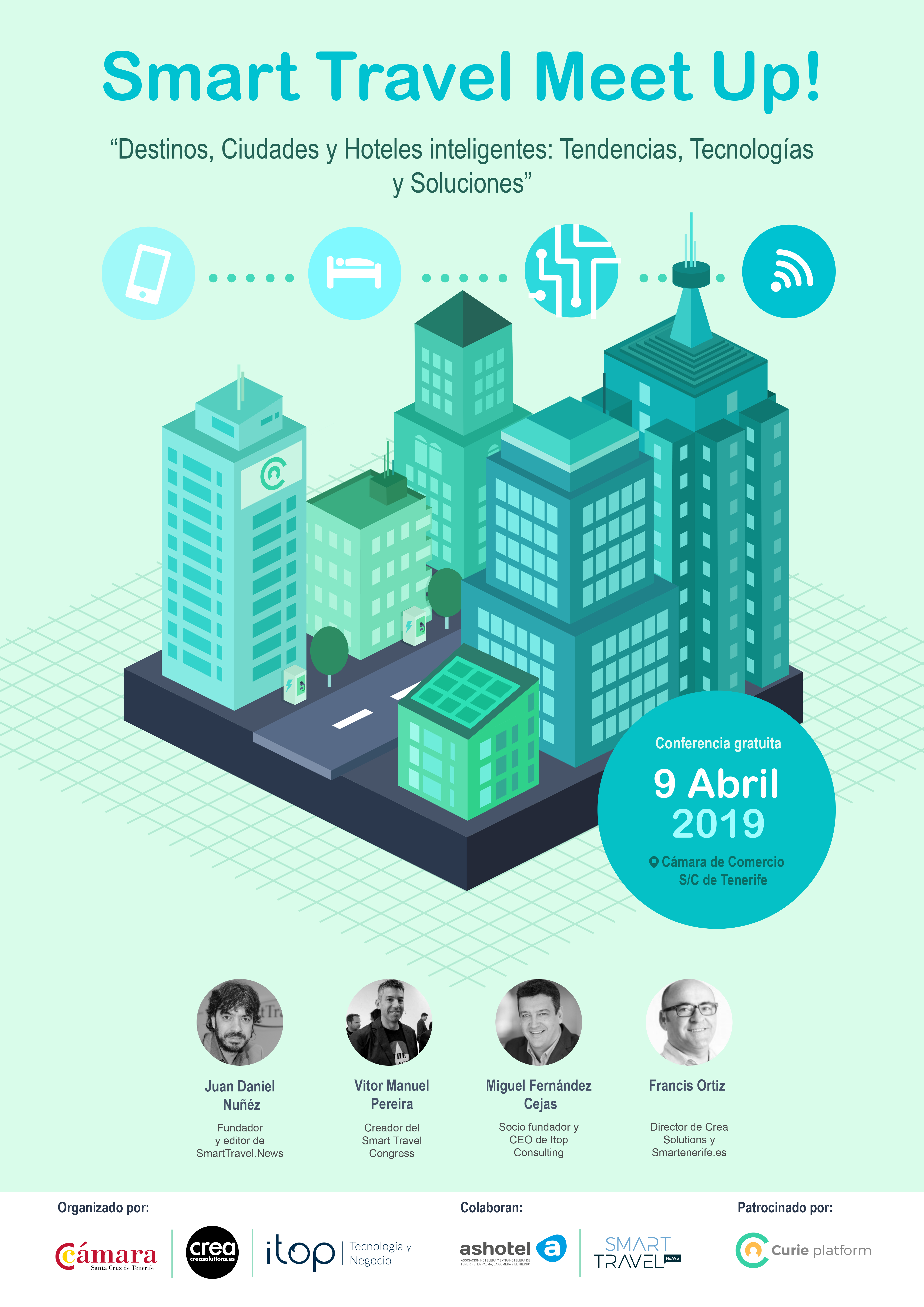 En Smart Travel Meet Up! se contará con la presencia como ponentes de Juan Daniel Núñez, Fundador y Editor de SmartTravel.News, Vitor Manuel Pereira, director de Zoom Smart Cities, delegado de Smart City Council y fundador del Smart Travel Congress, Miguel Fernández Cejas, CEO de Itop Consulting, especializado en Tecnologías y Soluciones para Hoteles y Destinos y Francis Ortiz, director de Crea Solutions, UBIKUA y SmartTenerife.es, que hablará sobre Tecnologías Disruptivas, Transformación Digital e Innovación en Empresas y Organizaciones Públicas.