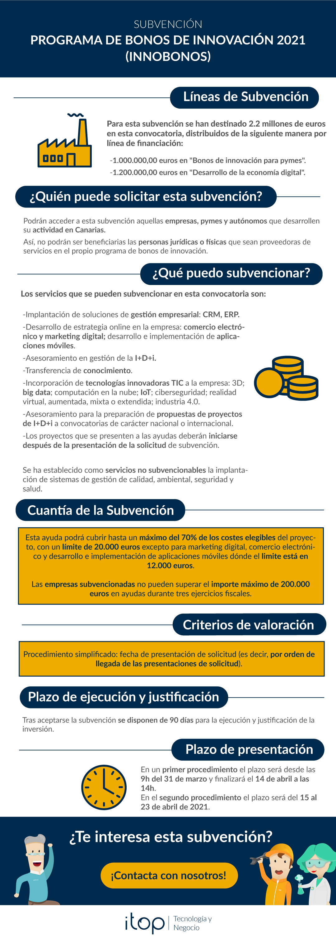 Desde Itop te acompañamos durante todo el proceso de implantación que vayas a realizar y te facilitamos en tiempo y forma toda la documentación que necesitas presentar para la justificación del proyecto tecnológico que hemos acometido para la mejora de los procesos en tu empresa.