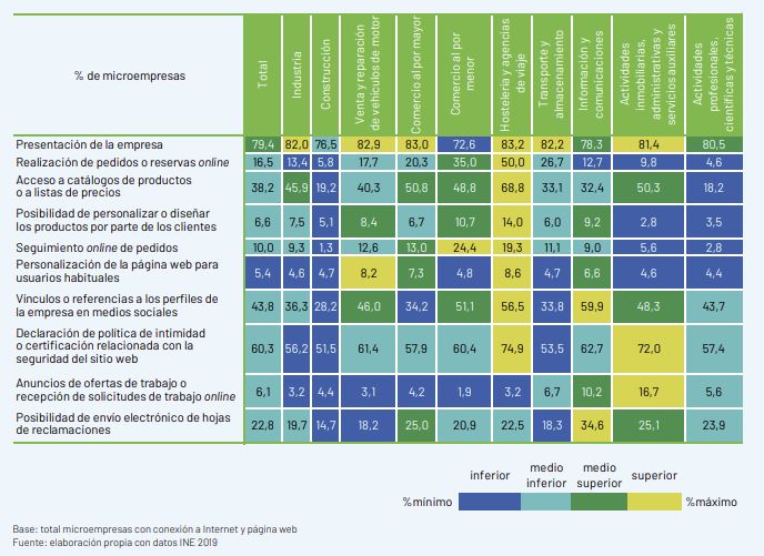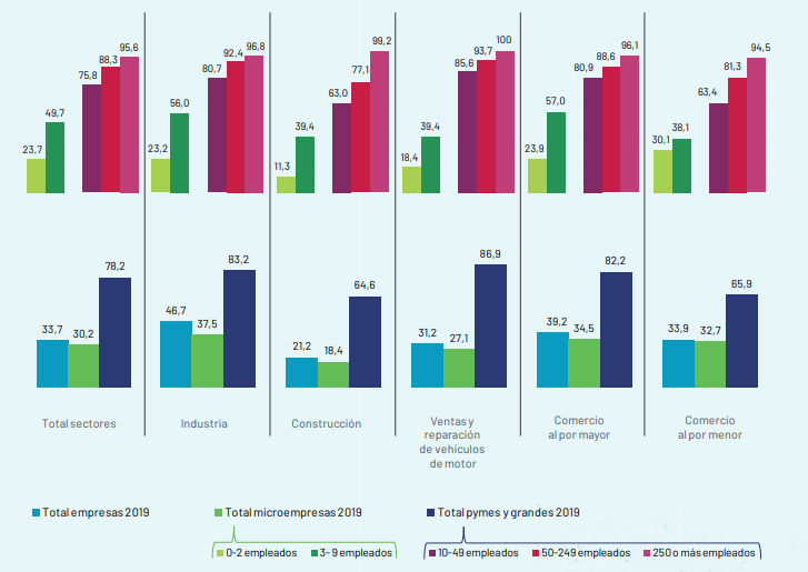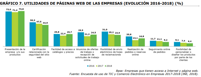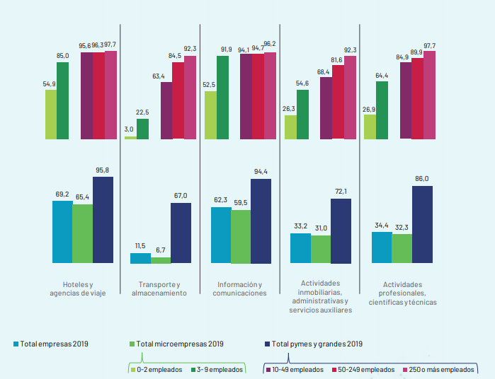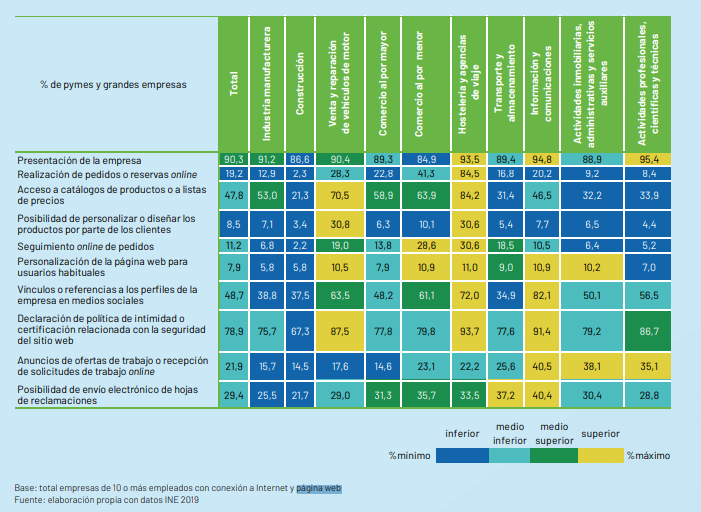 Según el Informe E-PYME 2019 edición 2020 más de un tercio de la totalidad de las empresas españolas cuenta con una página web. Los sectores que más uso hacen son el de hoteles y agencias de viaje y  el de información y comunicaciones, además las pymes y grandes compañías de dichos sectores son las que superan el 90% en cuanto a la disponibilidad como podemos ver en la primera parte de está gráfica