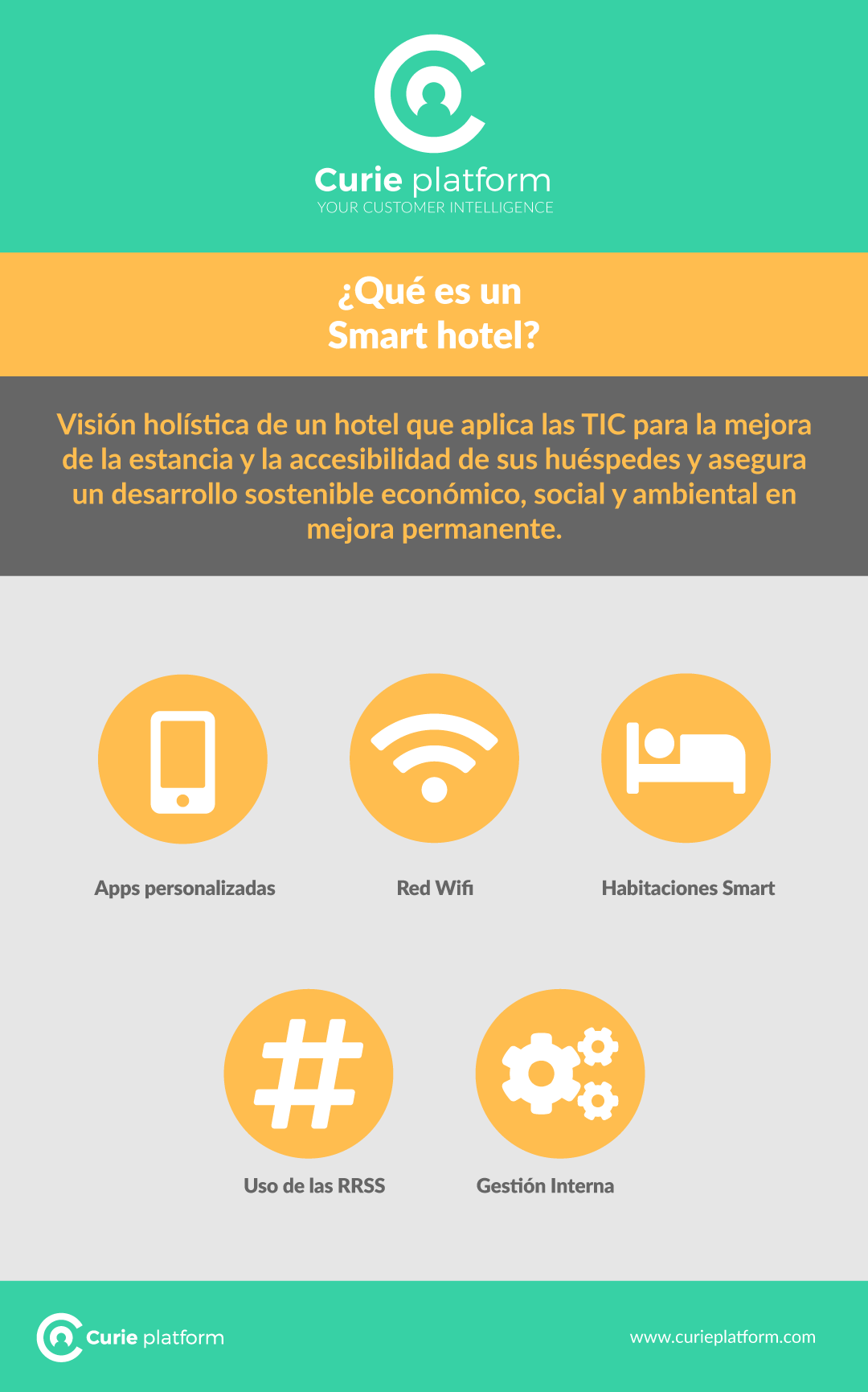 • Mobile: además de estar construído bajo el concepto “Mobile First” o “Móvil Primero”, Smart Hotel by Curie Platform integra la capacidad de generar apps móviles como soporte a los procesos CRM.