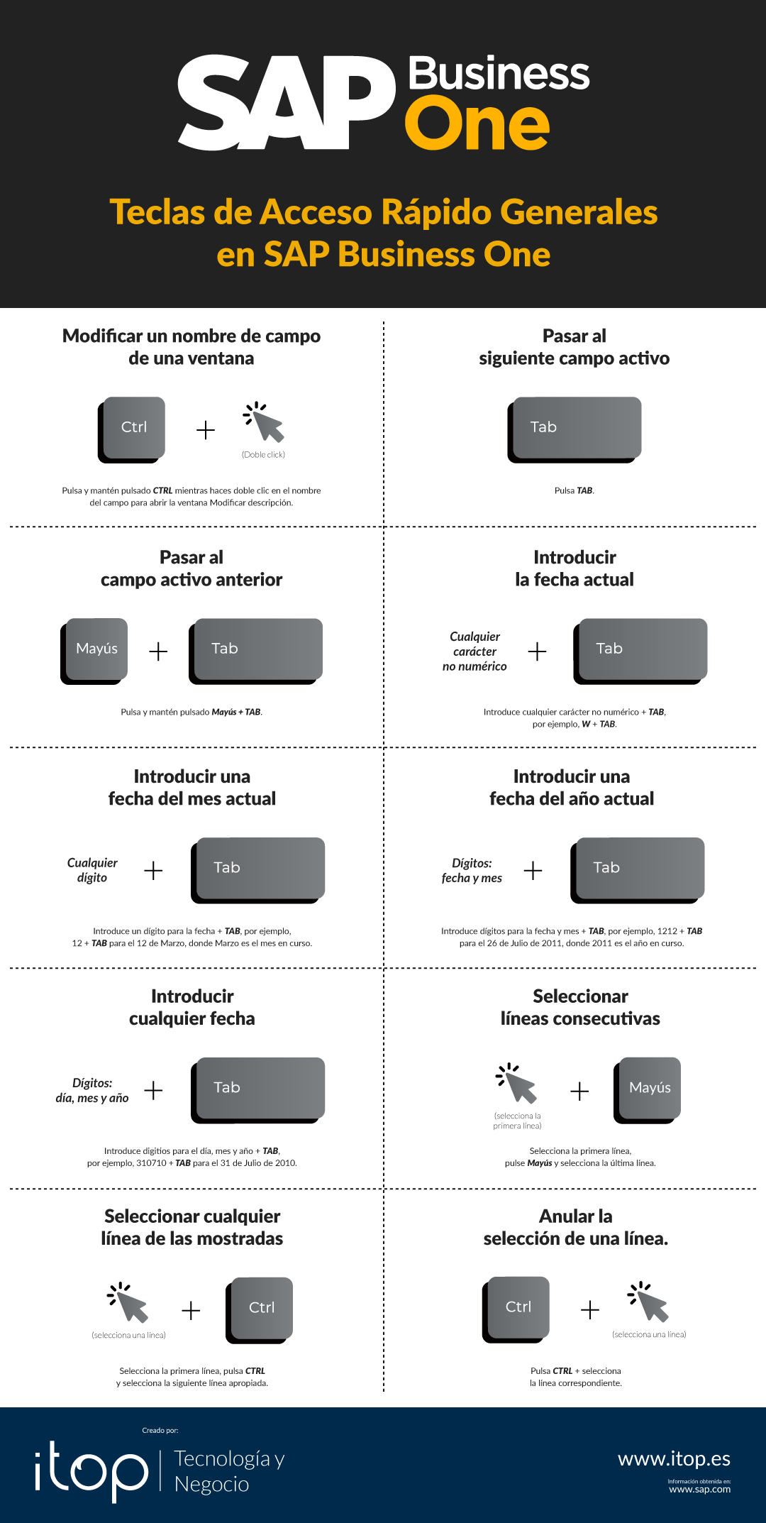 • Teclas de acceso rápido generales de SAP Business One (debajo te adjuntamos una infografía de estas teclas).