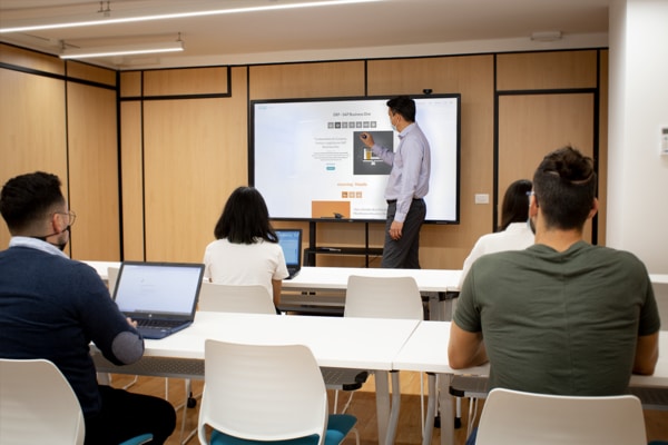Este aula está totalmente equipada para adaptarse a cualquier necesidad formativa. Se trata de un espacio versátil, moderno y con diferentes posibilidades de configuración según las necesidades formativas, tipo de dinámicas a aplicar o el aforo máximo a completar, WIFI de alta velocidad, una pantalla táctil de +85 pulgadas de última generación, capacidad para 30 personas en 70 metros cuadrados, y un mobiliario completamente renovado. Otra de las principales características de las nuevas instalaciones de Itop ,y en concreto del aula de formación, es que se dispone de un sistema de renovación de aire continuo cada 15 minutos especialmente relevante en el periodo actual de pandemia.
