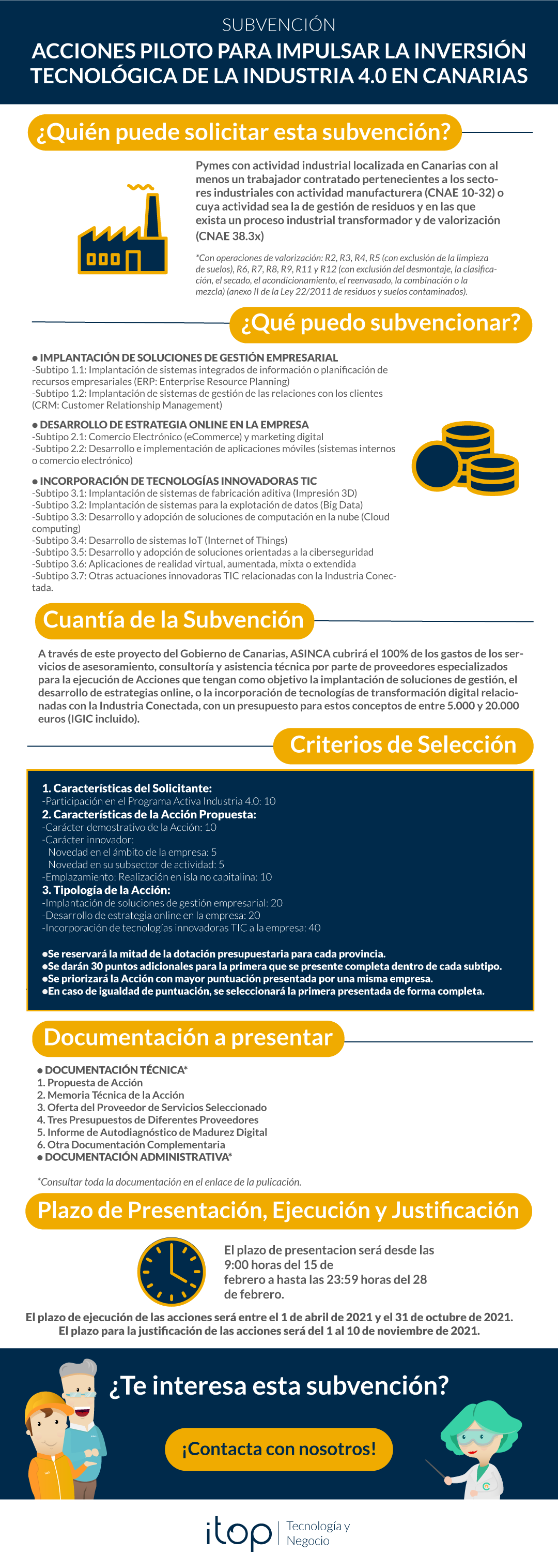 "Acciones piloto para impulsar la inversión tecnológica de la Industria 4.0 en Canarias", un proyecto promovido por ASINCA y subvencionado por el Gobierno de Canarias para impulsar la transformación digital y la utilización de las TICs en las Pymes Industriales, impulsando, a su vez, la inversión tecnológica de la Industria 4.0 en Canarias.
