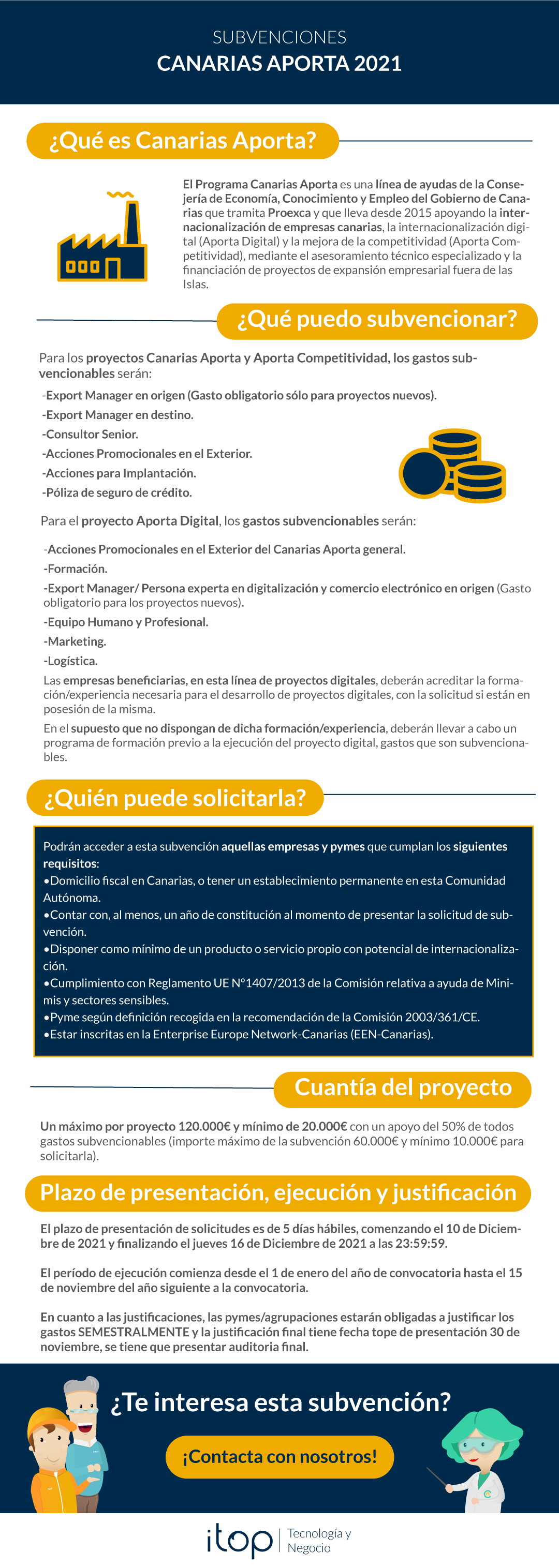 Desde Itop te acompañamos durante todo el proceso de implantación que vayas a realizar y te facilitamos en tiempo y forma toda la documentación que necesitas presentar para la justificación del proyecto tecnológico que hemos acometido para la mejora de los procesos en tu empresa.