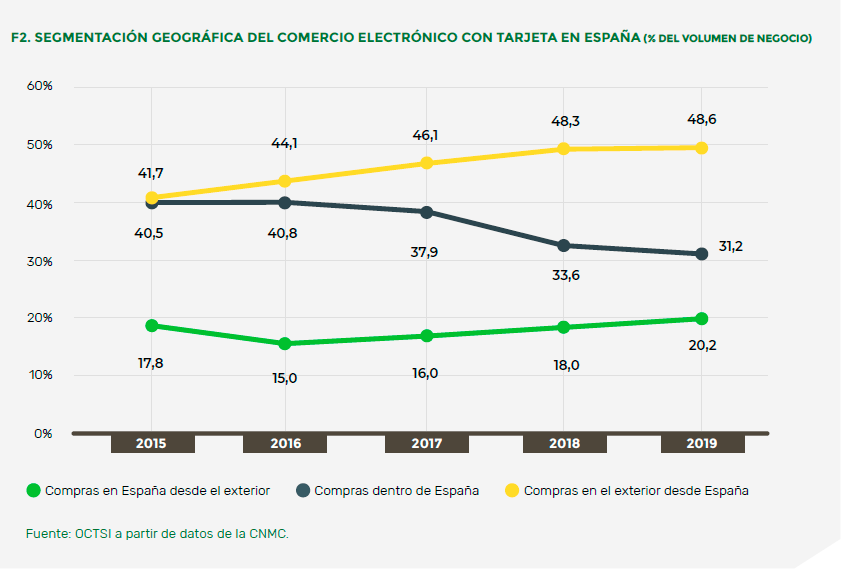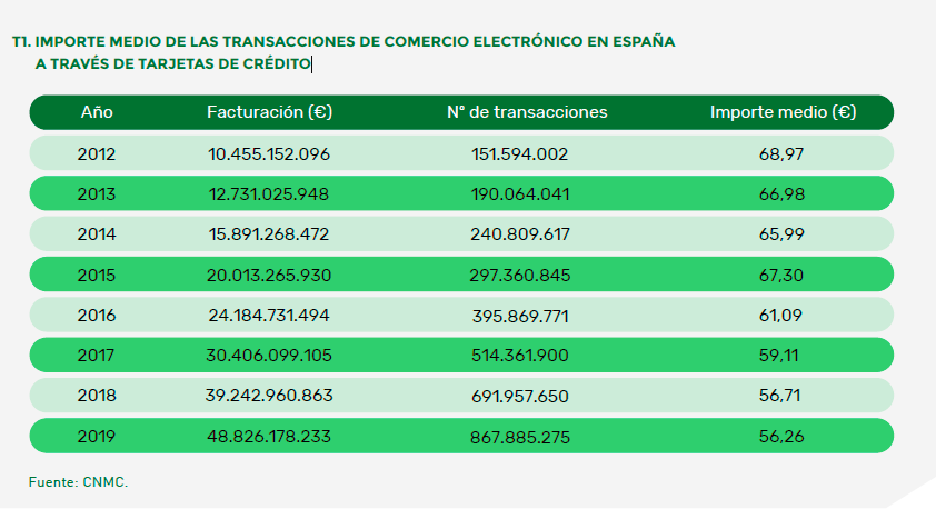 Según la Comisión Nacional de los Mercados y la Competencia (CNMC), el comercio electrónico a través de tarjetas de crédito facturó en España 48.826 millones de euros en 2019 (un 24% más que el año anterior) con 868 millones de transacciones (con un crecimiento interanual del 25%).