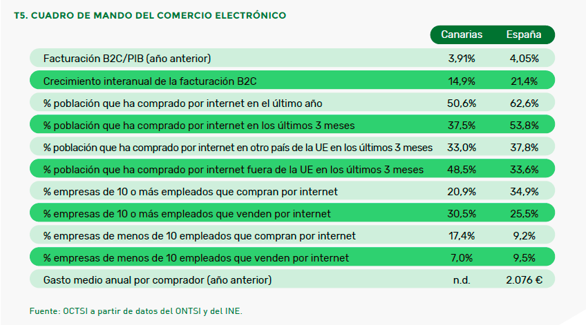 En el año 2019 un 50,6% de la población de Canarias entre 16 y 74 años realizó compras por comercio electrónico, lo que supone cerca de 900.000 personas. A pesar del crecimiento experimentado en el último año, la cifra del Archipiélago se distancia de la media nacional, que supera el 62%. La tasa de crecimiento anual compuesto en los últimos cinco años es del 9,3% en España y del 11,3% en Canarias.