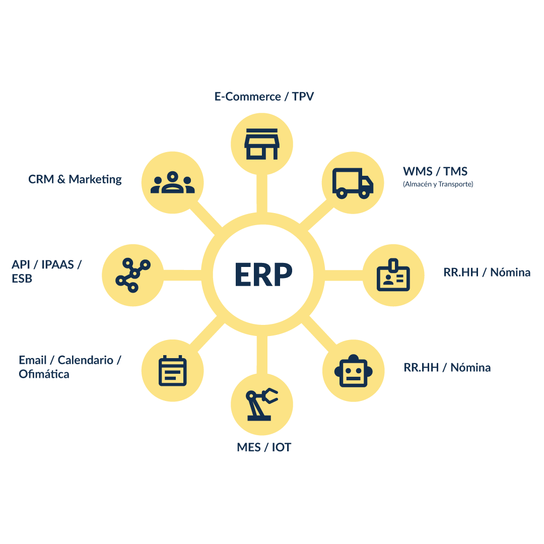 Los ERP modernos se conectan con todo el ecosistema digital —CRM/marketing, ecommerce/TPV, WMS/TMS, finanzas/banca, RR. HH., BI/Analytics o RPA— mediante APIs, conectores nativos e iPaaS. Resultado: datos sincronizados, cero silos y trazabilidad end-to-end para operar más rápido, ofrecer una experiencia unificada y tomar decisiones en tiempo real.